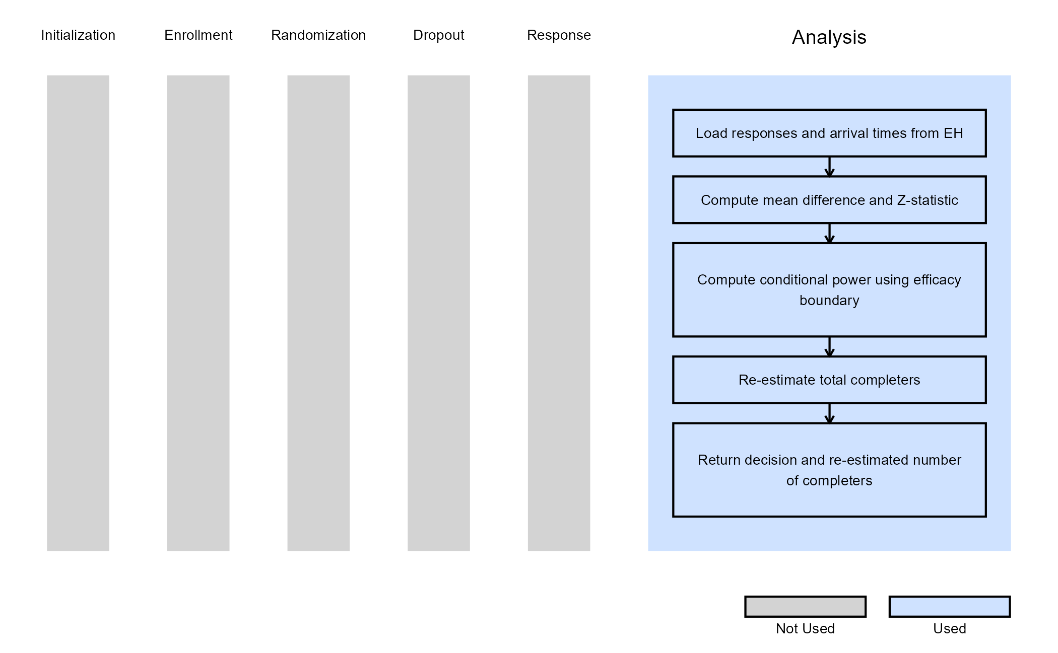 The objective is to demonstrate a straightforward way to modify both the analysis and decision-making process. The computed test statistic is compared to the efficacy boundary provided by East Horizon or East as input. This example does not include a futility rule and does not use any user-defined parameters.