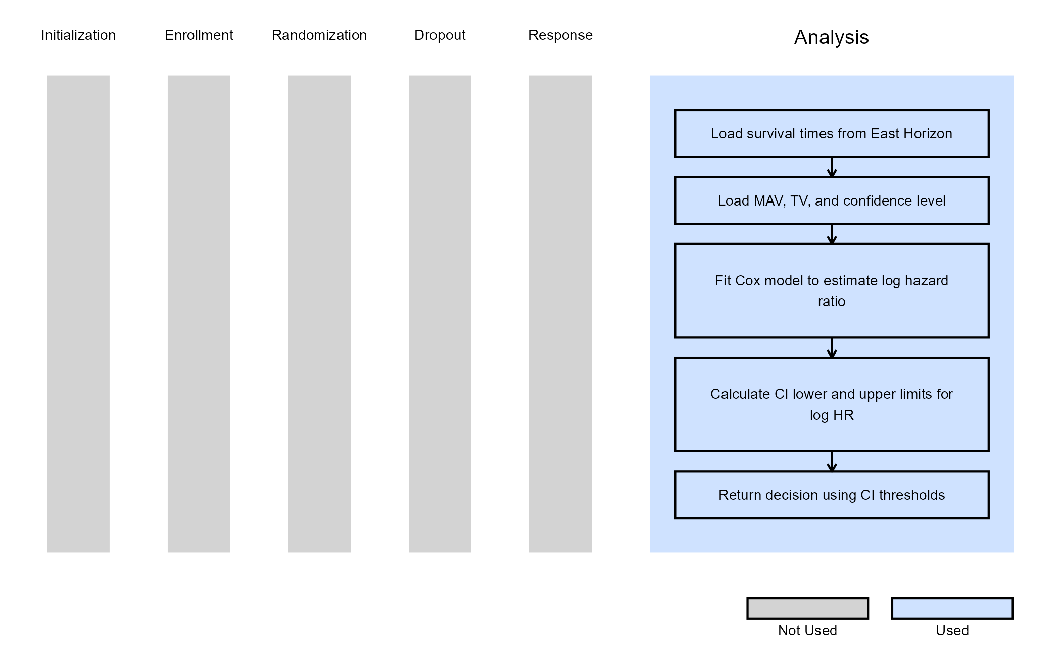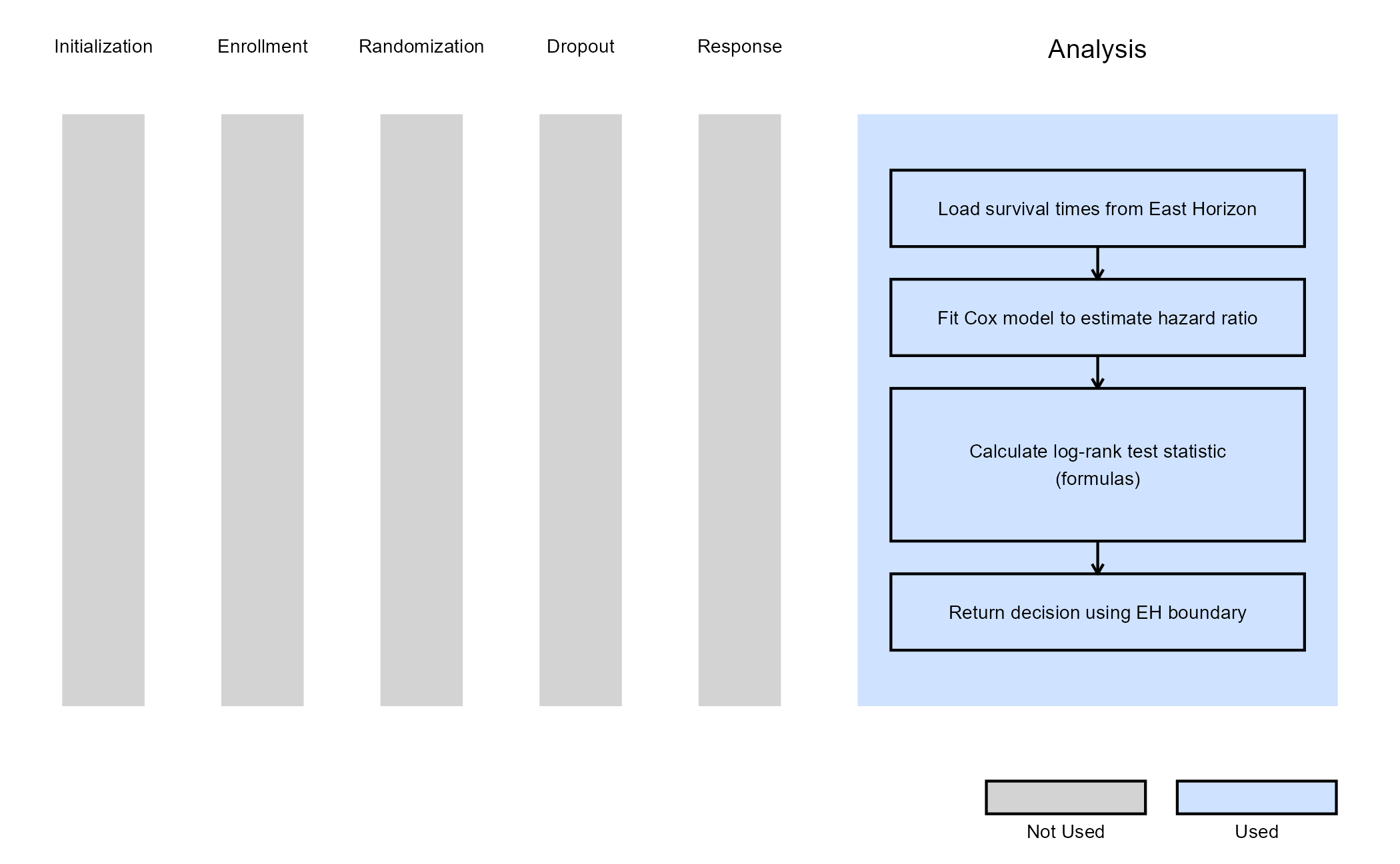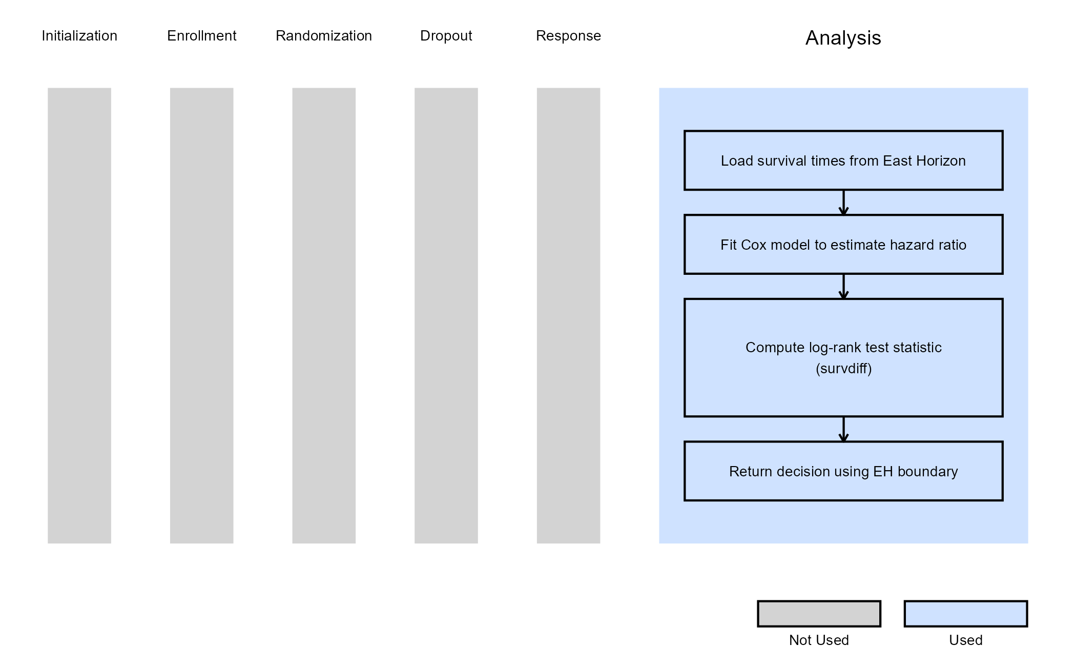 The following examples illustrate how to integrate new analysis capabilities into East Horizon or East using R functions in the context of a two-arm trial. In each example, the trial design includes a standard-of-care control arm and an experimental treatment arm, with patient outcomes modeled as time-to-event data. The design includes two interim analyses (IA) and one final analysis (FA). At each IA, an analysis is conducted which may lead to early stopping for efficacy or futility, depending on the predefined design criteria.
