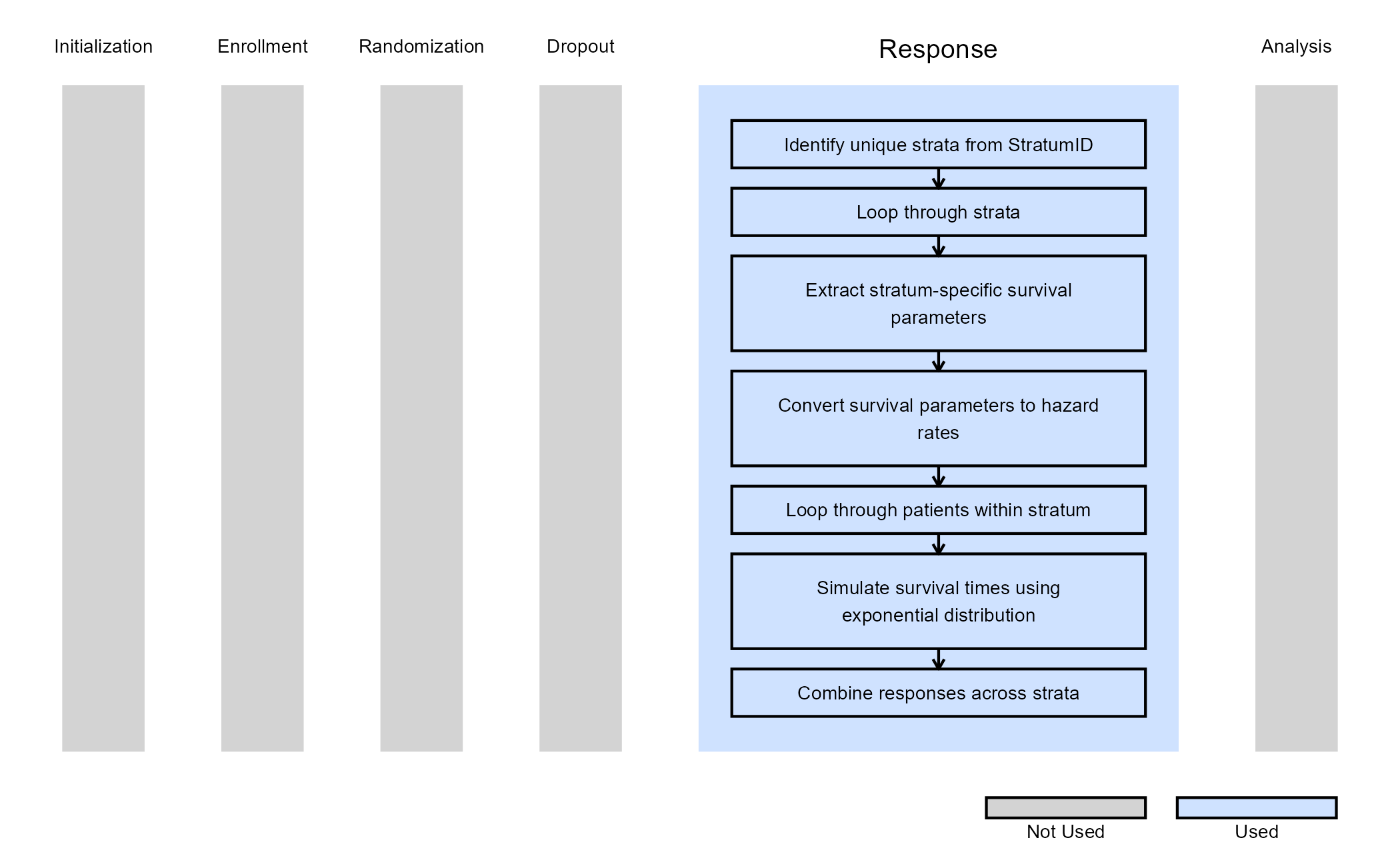 For each stratum, the survival parameters provided in East Horizon are converted into arm-specific hazard rates. Patient survival times are then simulated independently within each stratum using an Exponential distribution. This approach enables realistic modeling of heterogeneous patient populations where baseline risk differs across strata.