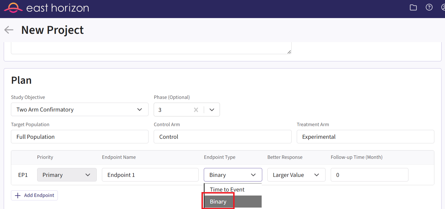 - On East Horizon, create a new project with a binary endpoint.