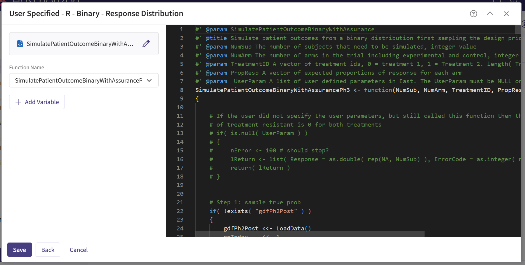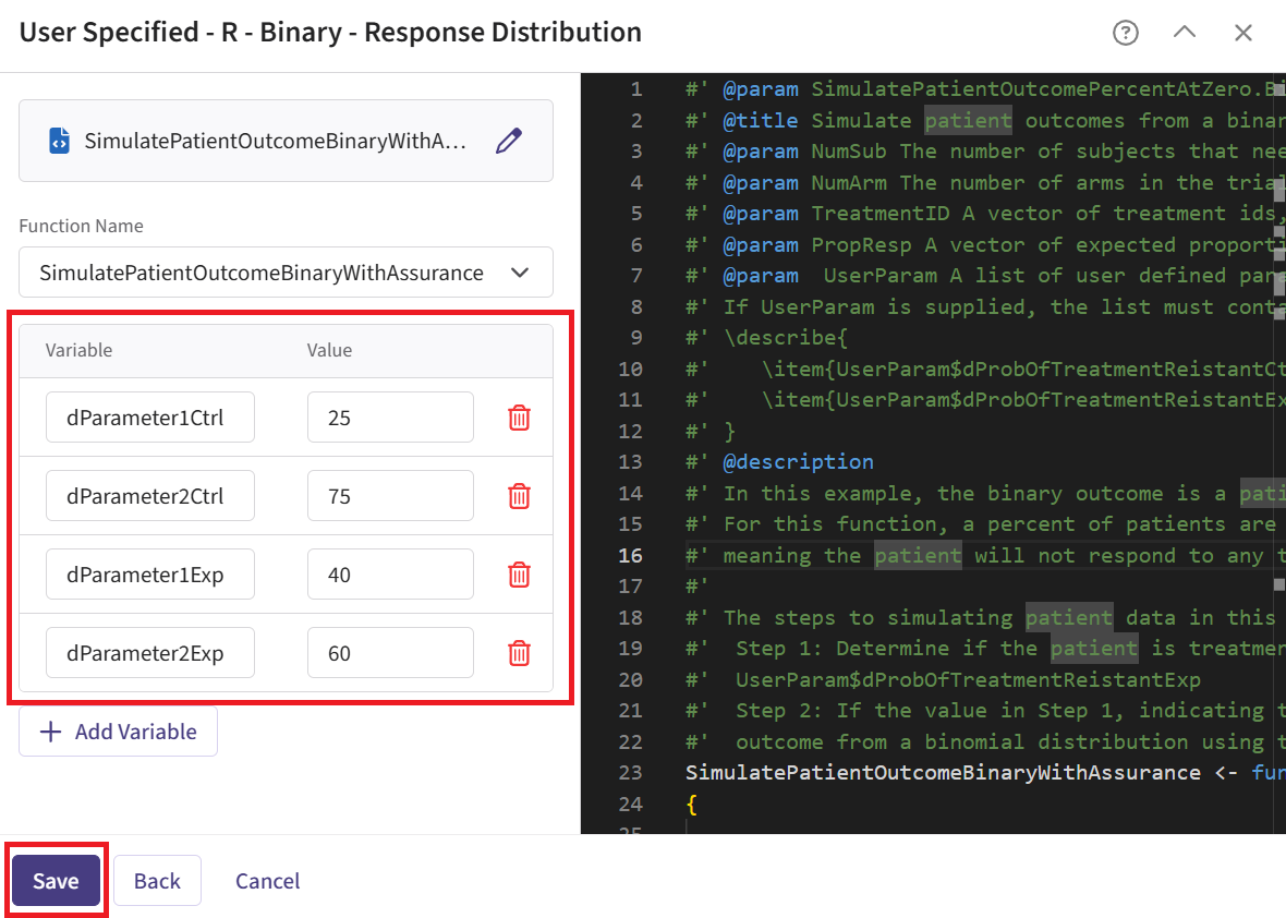 In the R script, the TrueProbabilityControl and TrueProbabilityExperimental that were generated in the Response section are loaded from SimData outputs, and returned at the end function. This is important because these variables will appear in the Phase 2 results and will be saved to a CSV file. They will later be reused in Phase 3 by loading the saved values as the input for the response generation step in the simulations. See Steps 24 and 25 of the Step-by-Step Instructions section for more information on the loading process.