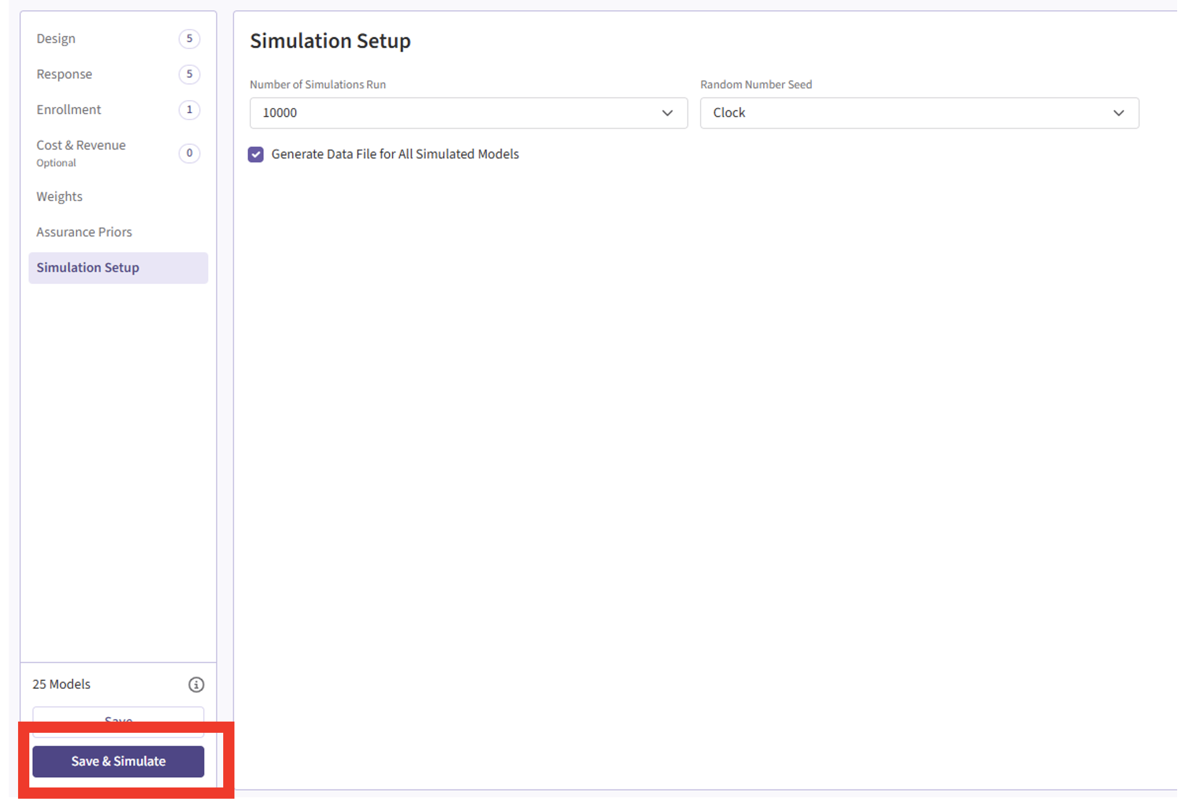 - Check the box to “Generate Data File for All Simulated Models”.