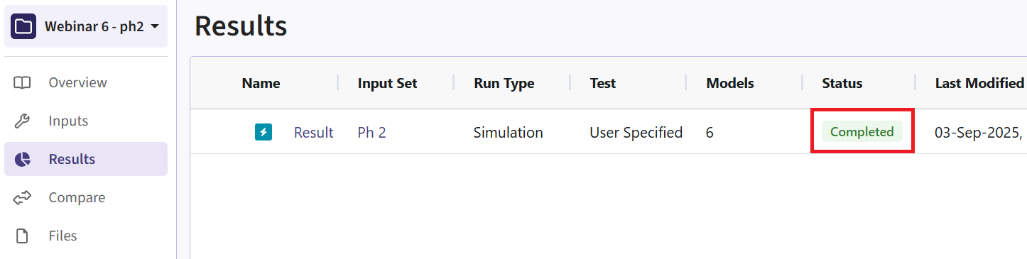 - Navigate to the Results tab, then check whether the Phase 2 simulation failed or was completed by looking at the Status column.
