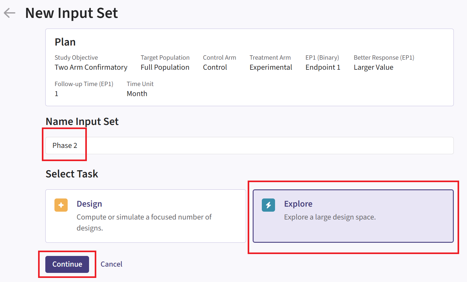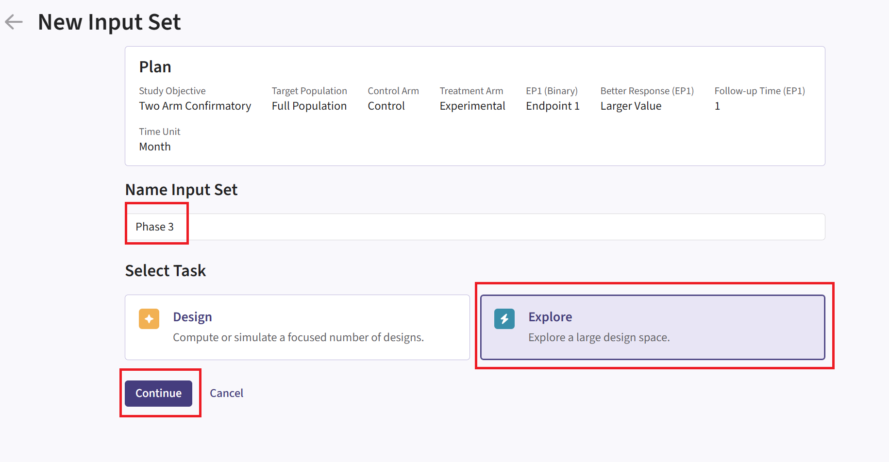 In this example, we will create two different input sets: one for the Phase 2 study and one for the Phase 3 study.