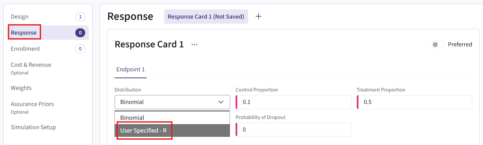 - Navigate to the Response page, create an input card, and then select “User Specified – R” in the Distribution field.