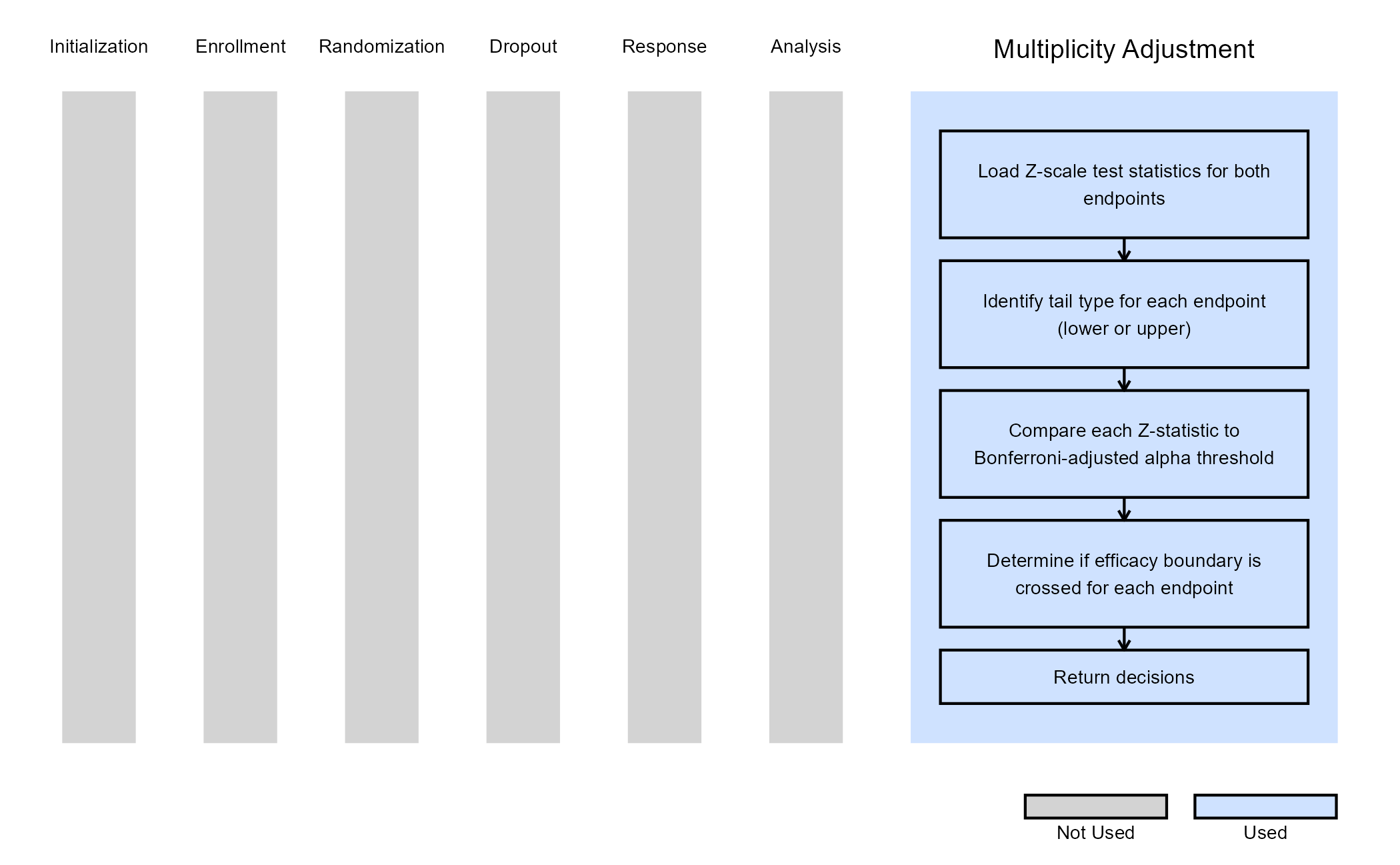 It evaluates the test statistics for each endpoint and determines whether the efficacy boundary has been crossed. For lower-tail tests, it compares the cumulative probability of the test statistic to half of the total alpha, and for upper-tail tests, it uses the upper-tail probability. If the probability is below the threshold, the endpoint is marked as having crossed the efficacy boundary; otherwise, no boundary is considered crossed. The function returns a list containing the endpoint decisions. This implementation assumes a single-look, fixed sample design with no dropouts.