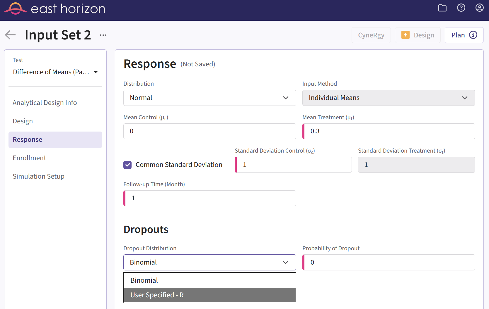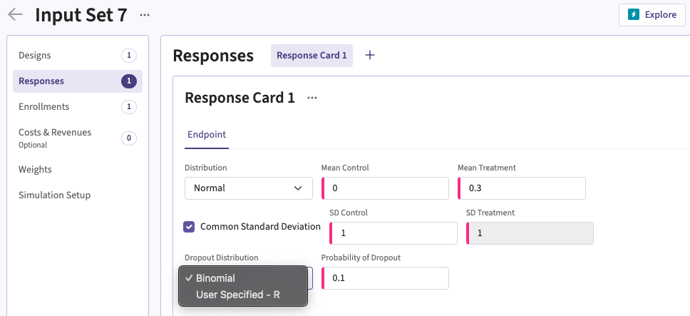 You can set up a dropout function under Dropout Distribution in a Response Card while creating or editing an Input Set. For a Time-to-Event outcome or a Continuous outcome with Repeated Measures, it will be under Distribution in the Dropout Rate tab of the Response Card.
