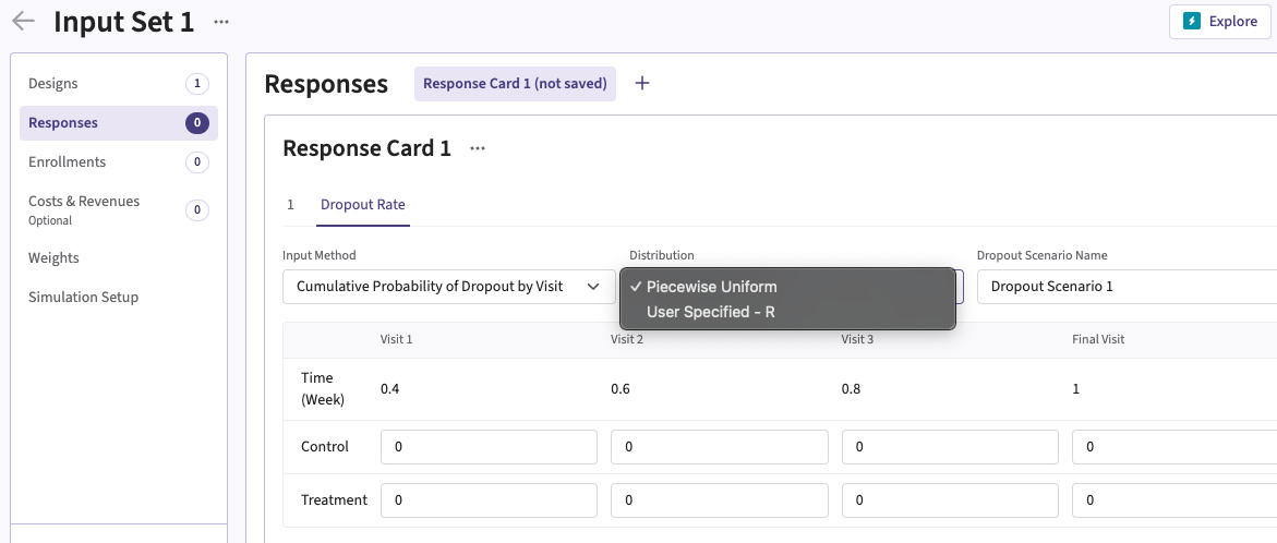 - Select User Specified-R from the dropdown in the Dropout Distribution or Distribution field in the Response Card.