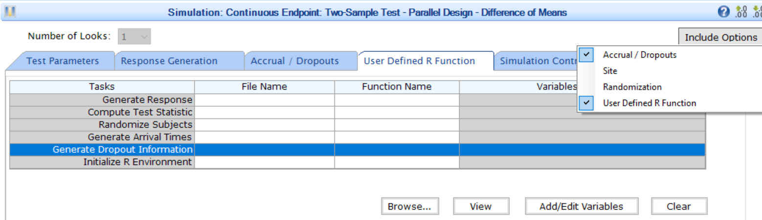 - Click on the Include Options button on the top right corner of the Simulation Input window and select both Accrual / Dropouts and User Defined R Function.