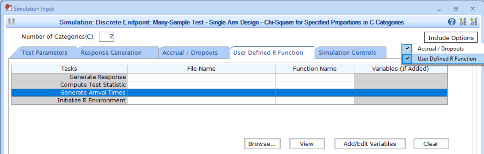 - Click on the Include Options button on the top right corner of the Simulation Input window and select both Accrual / Dropouts and User Defined R Function.