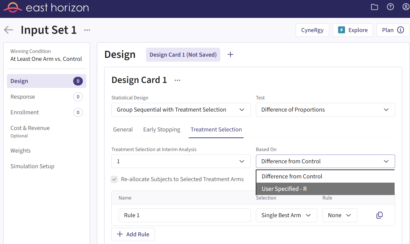 The Treatment Selection integration point allows you to customize the selection of arms to carry forward after an interim analysis using a custom R script. Instead of relying on the limited settings (rules) of East or East Horizon, such as selecting a fixed number of top treatments or applying a threshold, you can implement entirely alternative methods to better suit your trial’s requirements. For example, you could use Bayesian rules.