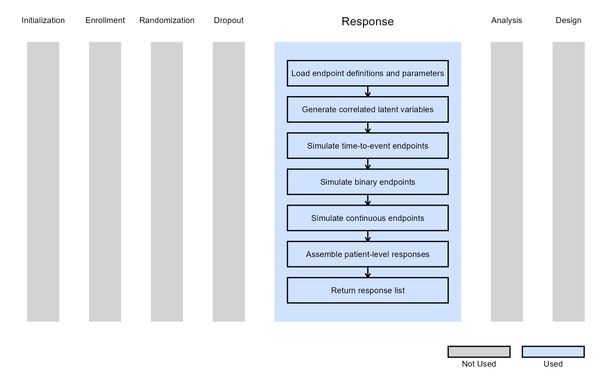 The function GenerateMEPResponse simulates patient-level outcomes for a two-arm clinical trial with an arbitrary number of endpoints. Each endpoint can independently be defined as continuous, binary, or time-to-event. All endpoints are generated within a single unified Response function. No user-defined parameters are used in this example.
