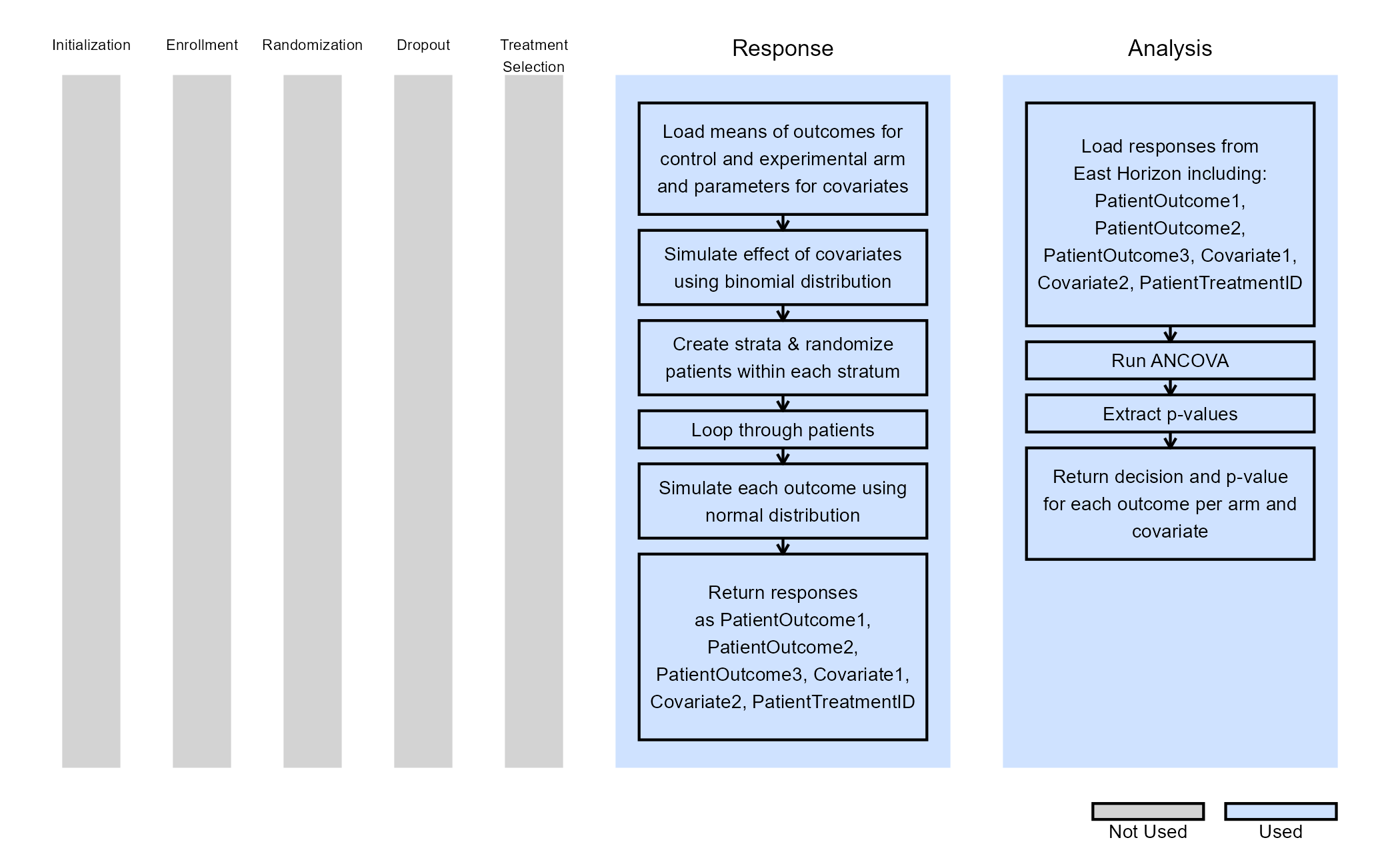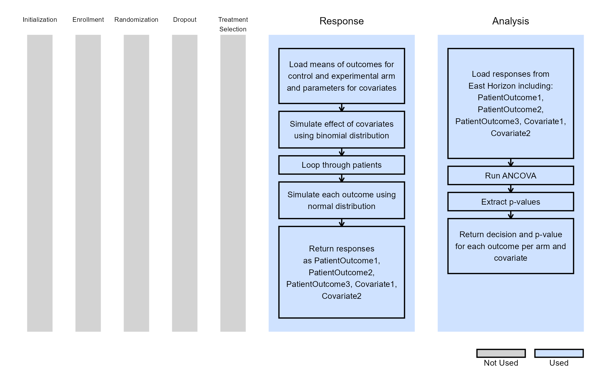 The following examples illustrate how to incorporate new patient outcome simulation (response) and analysis (design) capabilities into East Horizon using R functions in the context of a two-arm trial. Each example features a trial design consisting of a standard-of-care control arm and an experimental treatment arm, with three independent patient outcomes modeled as continuous data.