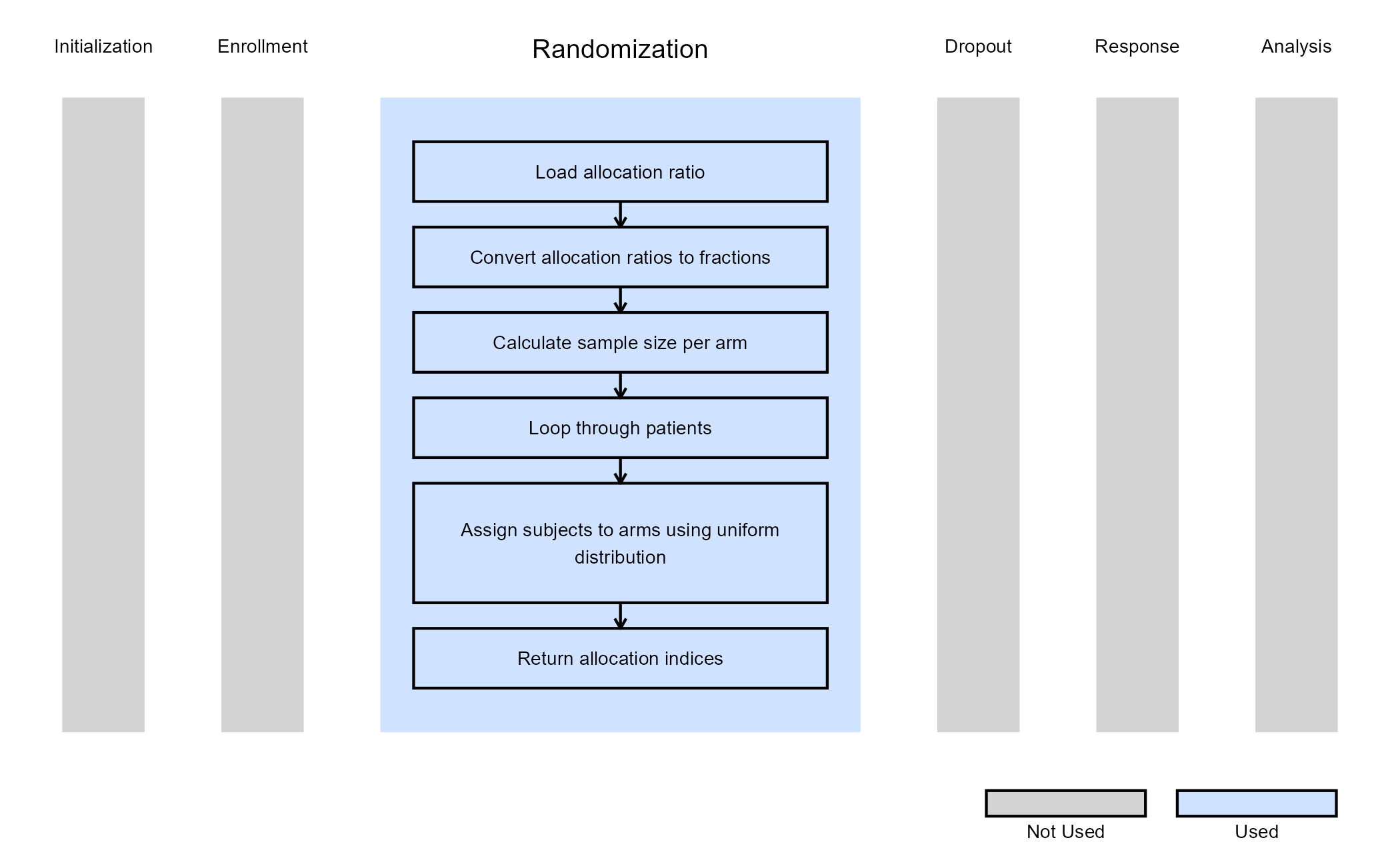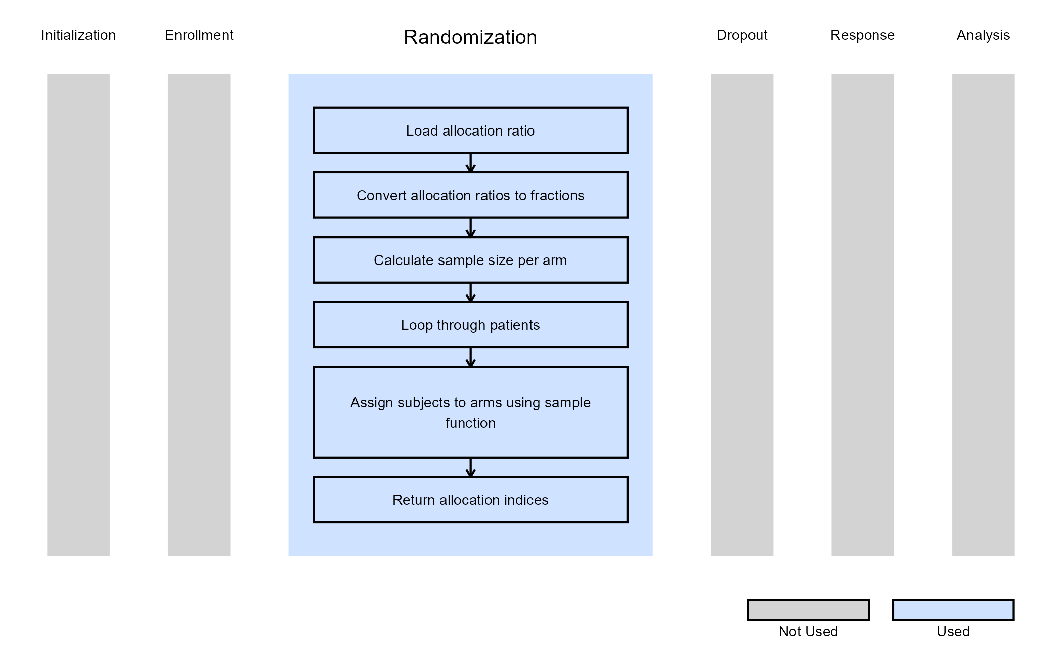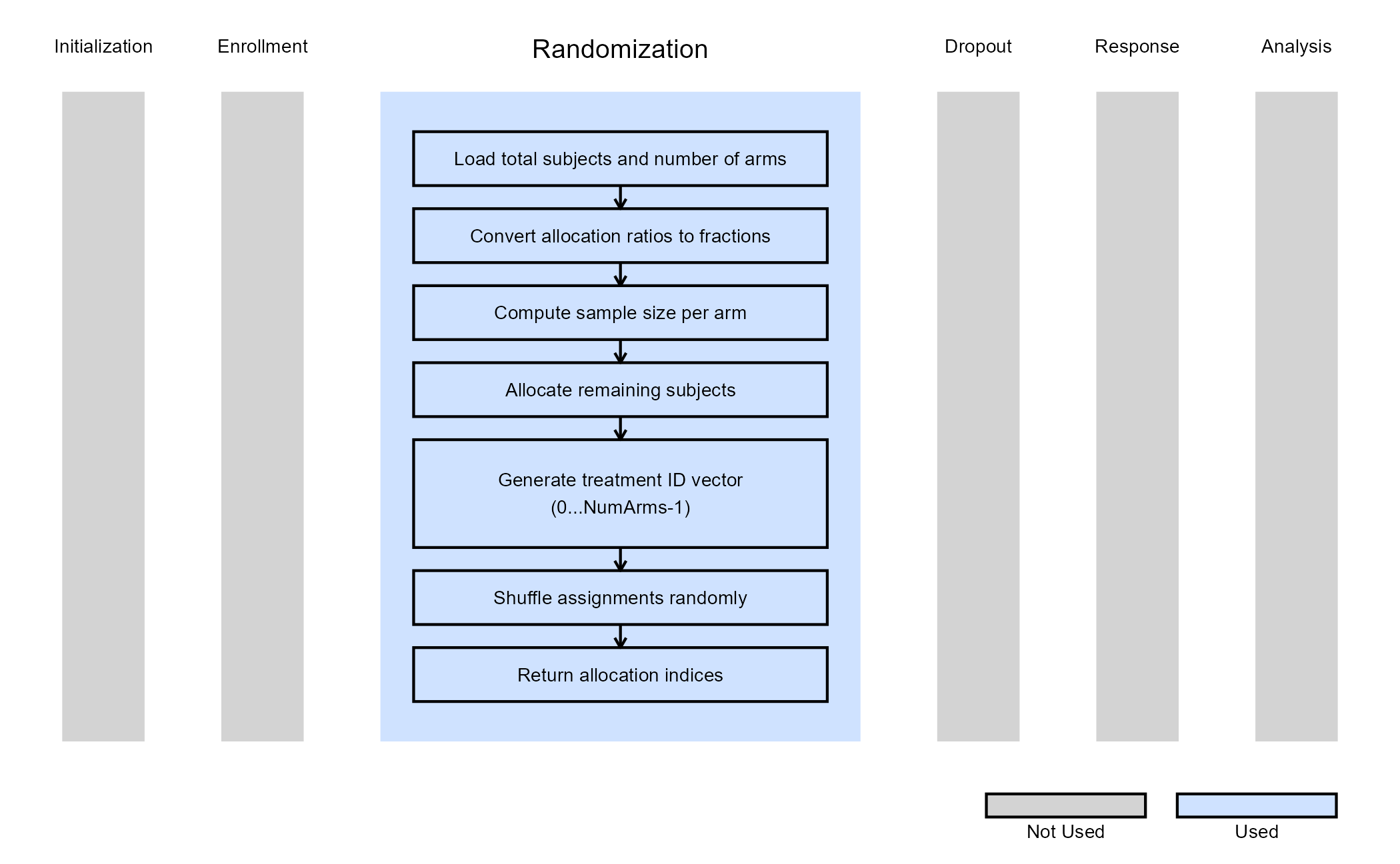 This function dynamically handles any number of arms and allocates subjects according to specified allocation ratios. It extends the logic of the two-arm randomization examples to generalize across an arbitrary number of treatment arms.