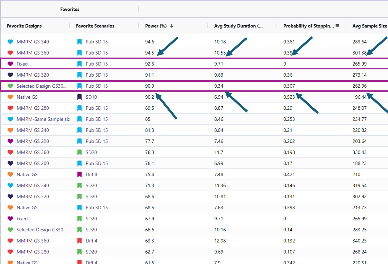 - Target power: Approximately 90% power is achieved with about 266 completers when the standard deviation is 15 and the mean difference is 6 (using the MMRM Fixed Design). For reaching this power there are 2 designs that effectively accomplish this. One should be the MMRM fixed design (named “Fixed”) and the other being MMRM Group-sequential with a sample size of 300 (named “Selected Design GS300”). Either of these designs are viable and the trade off will be discussed in the results discussion section.