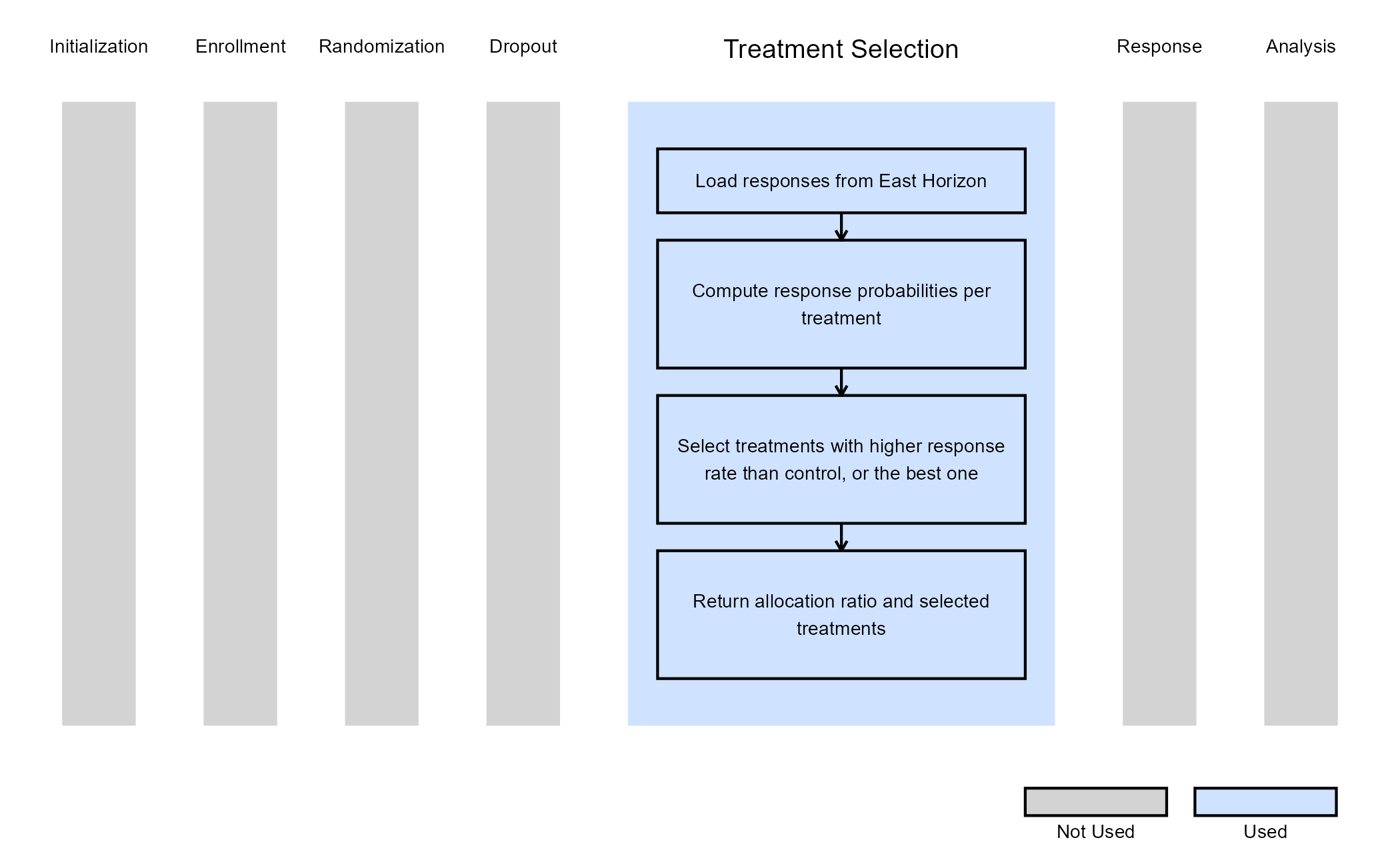 The following examples illustrate how to integrate new treatment selection capabilities into East Horizon or East using R functions in the context of a multi-arm trial. In each example, the trial design includes a standard-of-care control arm and three experimental treatment arms. The design includes one interim analysis (IA) and one final analysis (FA).