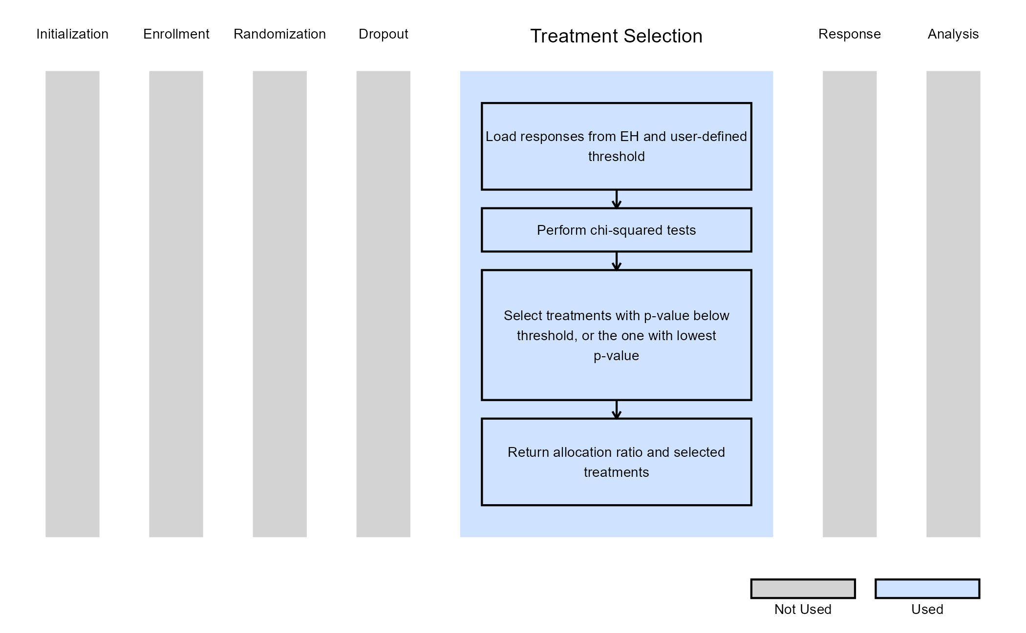 - If no treatment meets this criterion, the experimental arm with the smallest p-value is selected.