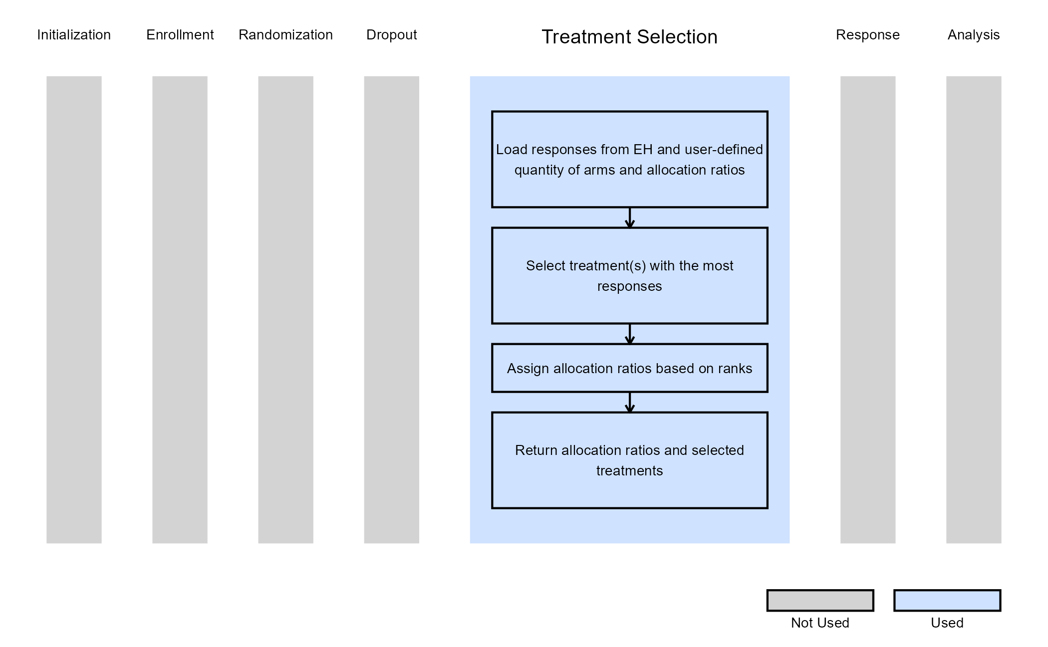 - A user-specified number of experimental treatments (QtyOfArmsToSelect) with the highest observed number of responses are selected for stage 2.