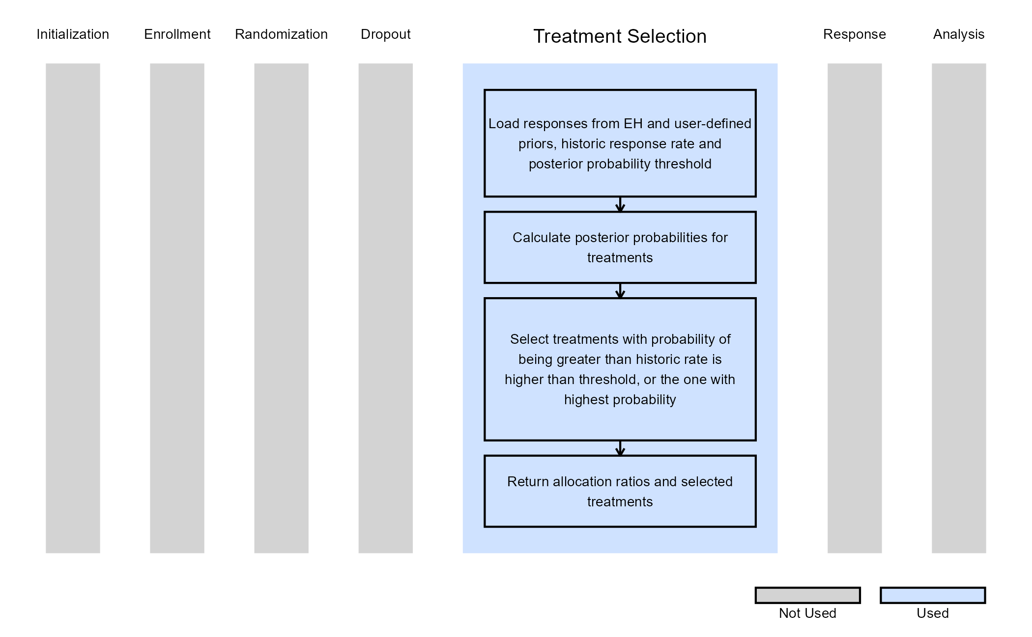 - If no treatment meets this threshold, we select the treatment with the highest posterior probability of exceeding the historical response rate.